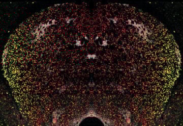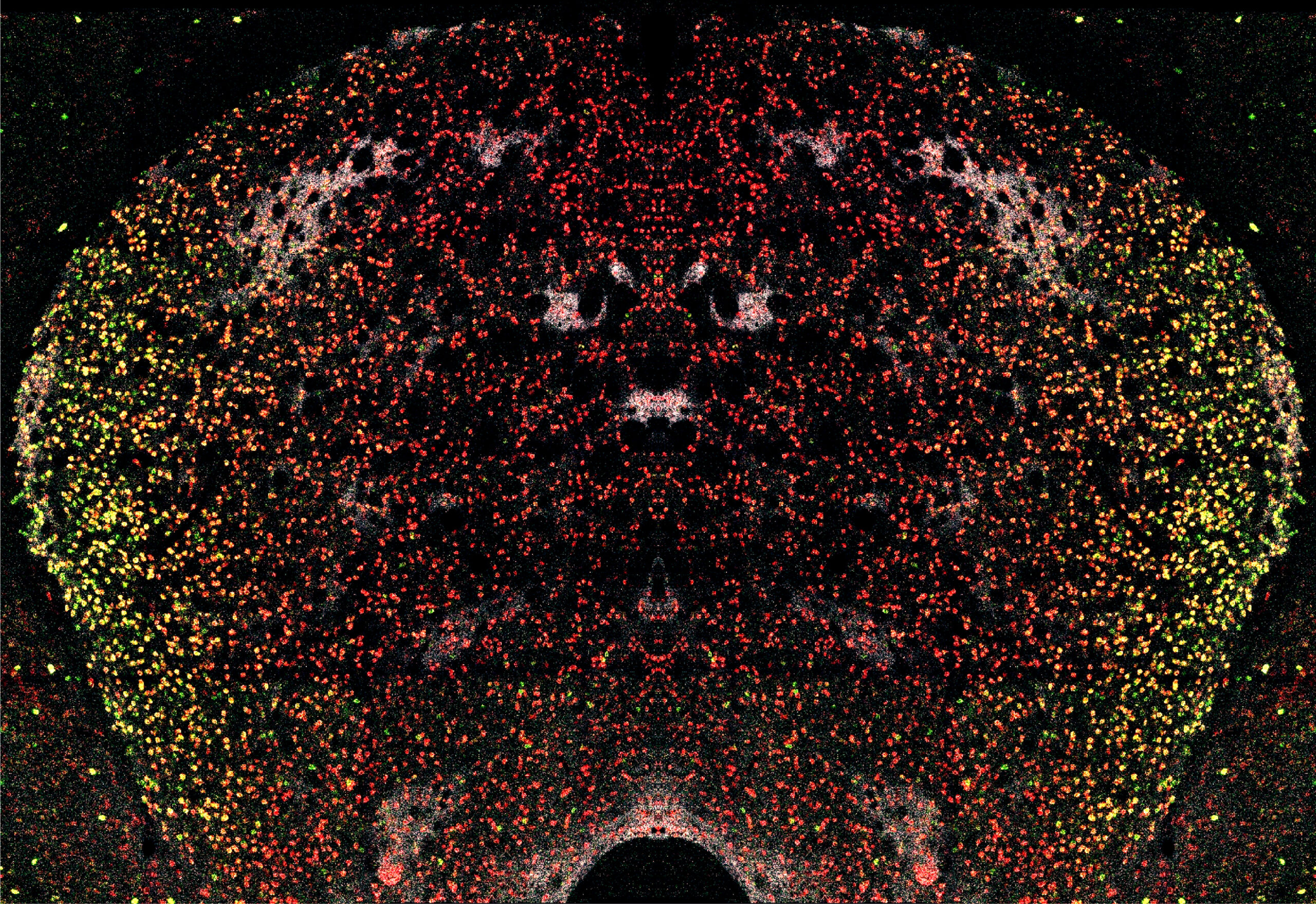 Sur cette photo, on peut observer une image symétrique et réfléchie du striatum, imagé obtenu à l’aide de la microscopie confocale à fluorescence. Les récepteurs CB1R sont en rouge et les récepteurs dopaminergiques de type 2 en vert. En blanc sont représentés les récepteurs µ-opioïdes.
