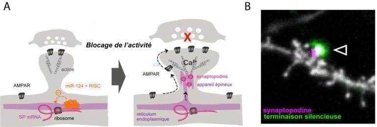 L’étude publiée dans EMBO Journal révèle au contraire un mécanisme où chaque synapse répond de manière autonome et individuelle à une diminution prolongée d’activité, en fonction de son état physiologique et biochimique propre. En combinant des approches d’électrophysiologie, de microscopie confocale et de biologie moléculaire sur cultures de neurones, cette étude montre en effet que seule une sous-population de synapses, les plus fortes et les plus grosses, augmentent leur nombre de récepteurs pour compenser la perte d’activité. Ce processus dépend d’une protéine appelée « synaptopodine » connue pour contrôler la plasticité synaptique et dont la synthèse locale est régulée par un microARN, miR-124. En utilisant une approche génétique pour bloquer la libération présynaptique de glutamate à des connexions individuelles, cette étude montre par ailleurs que des synapses isolées peuvent elles-mêmes « sentir » des perturbations locales d’activité présynaptique et, en retour, réguler leur propre activité indépendamment du reste du neurone. Cette étude fait donc évoluer la vision actuelle selon laquelle la plasticité synaptique homéostatique est un processus global et uniforme vers un paradigme plus complexe où chaque synapse réagit de manière autonome pour maintenir son propre niveau d’activité. De manière troublante et paradoxale, cette étude suggère que le neurone postsynaptique met en œuvre des mécanismes similaires que ce soit pour stocker une nouvelle information (plasticité Hebbienne) ou au contraire pour maintenir une activité stable face à une diminution d’activité (plasticité homéostatique).