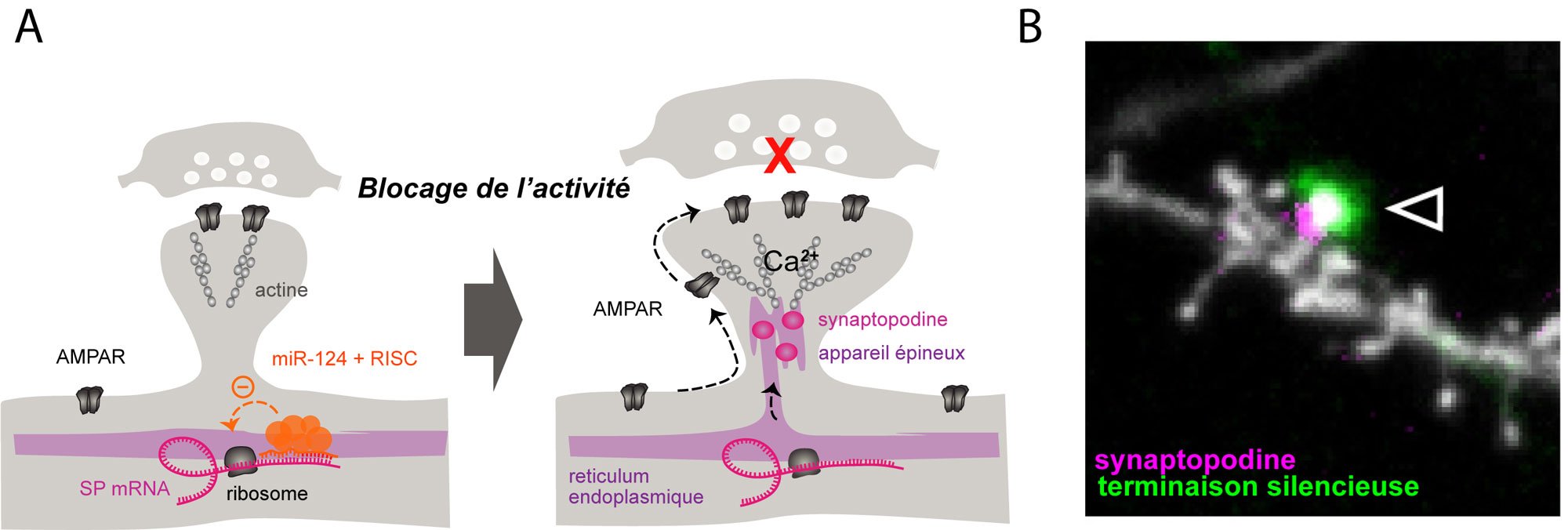 L’étude publiée dans EMBO Journal révèle au contraire un mécanisme où chaque synapse répond de manière autonome et individuelle à une diminution prolongée d’activité, en fonction de son état physiologique et biochimique propre. En combinant des approches d’électrophysiologie, de microscopie confocale et de biologie moléculaire sur cultures de neurones, cette étude montre en effet que seule une sous-population de synapses, les plus fortes et les plus grosses, augmentent leur nombre de récepteurs pour compenser la perte d’activité. Ce processus dépend d’une protéine appelée « synaptopodine » connue pour contrôler la plasticité synaptique et dont la synthèse locale est régulée par un microARN, miR-124. En utilisant une approche génétique pour bloquer la libération présynaptique de glutamate à des connexions individuelles, cette étude montre par ailleurs que des synapses isolées peuvent elles-mêmes « sentir » des perturbations locales d’activité présynaptique et, en retour, réguler leur propre activité indépendamment du reste du neurone. Cette étude fait donc évoluer la vision actuelle selon laquelle la plasticité synaptique homéostatique est un processus global et uniforme vers un paradigme plus complexe où chaque synapse réagit de manière autonome pour maintenir son propre niveau d’activité. De manière troublante et paradoxale, cette étude suggère que le neurone postsynaptique met en œuvre des mécanismes similaires que ce soit pour stocker une nouvelle information (plasticité Hebbienne) ou au contraire pour maintenir une activité stable face à une diminution d’activité (plasticité homéostatique).