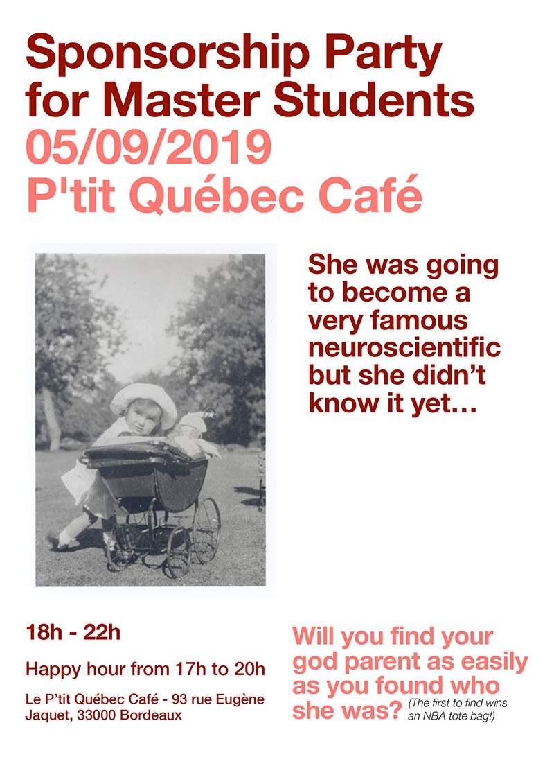 Comme chaque année, la NBA (Neuroscience Bordeaux Association) organise l’incontournable et très plébiscitée soirée parrainage pour les étudiants en Master. Le but est que chacun des nouveaux entrants (principalement en Master 1) soit parrainé par un ancien.